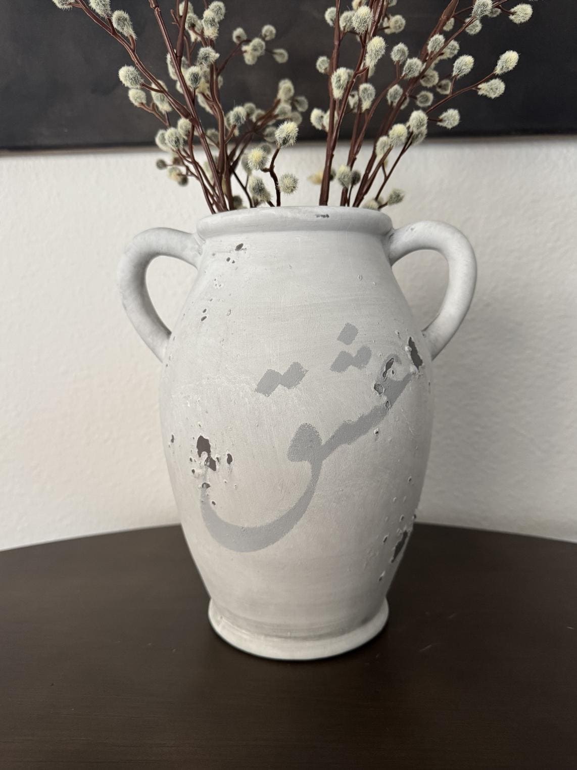 This ceramic vase features the phrase “eshgh” (سُهانهٔ عشق), meaning “love,” hand-painted in soft, neutral tones. Its classic silhouette and understated script make it a versatile accent for shelves, consoles, or coffee tables.
