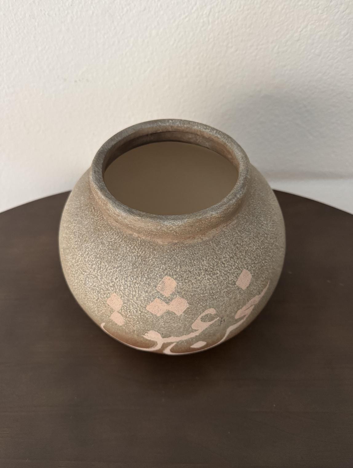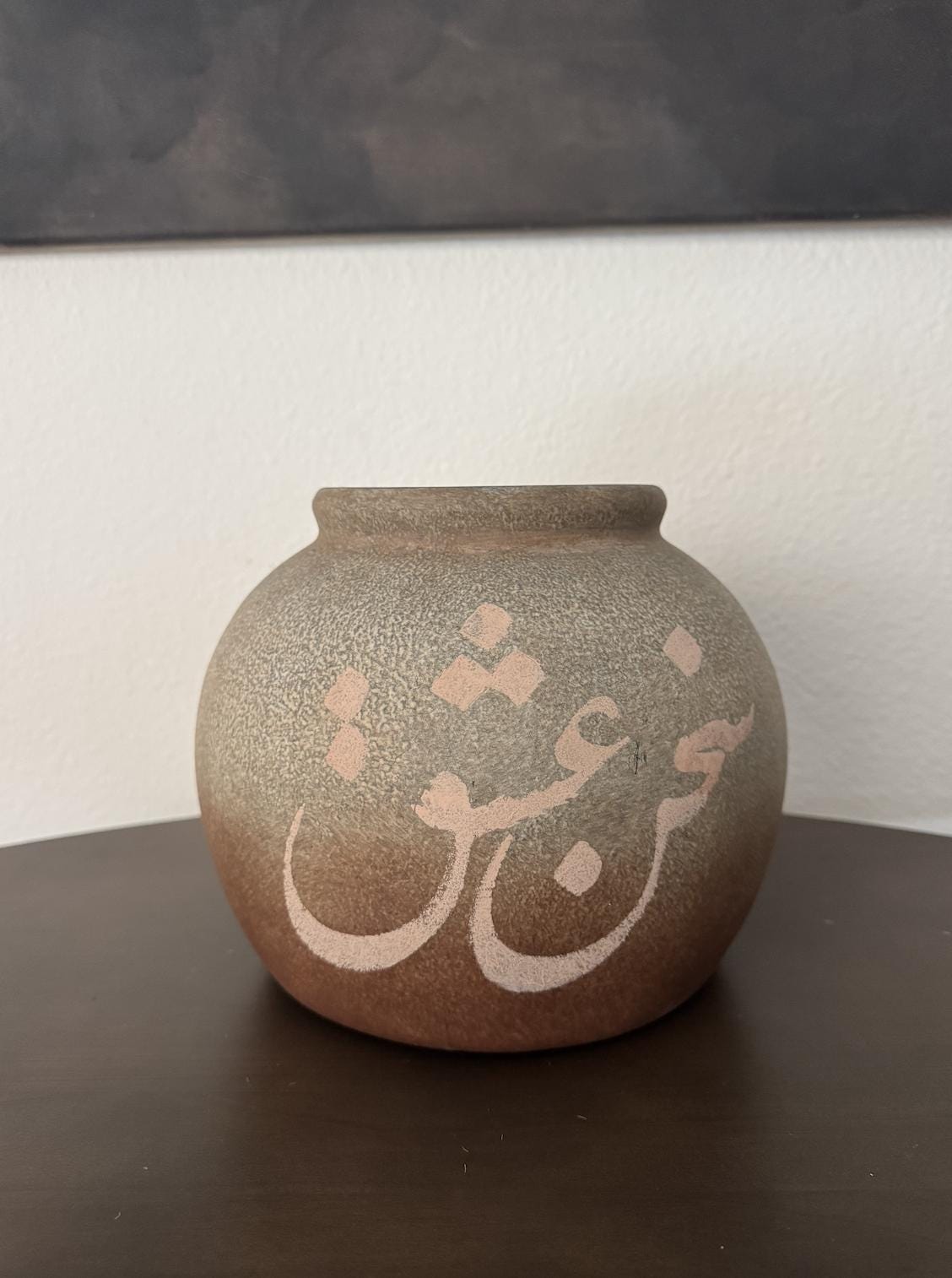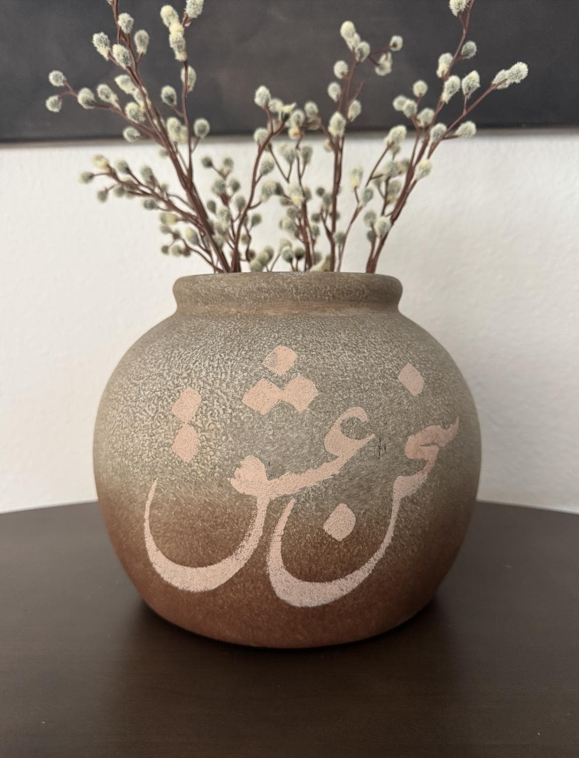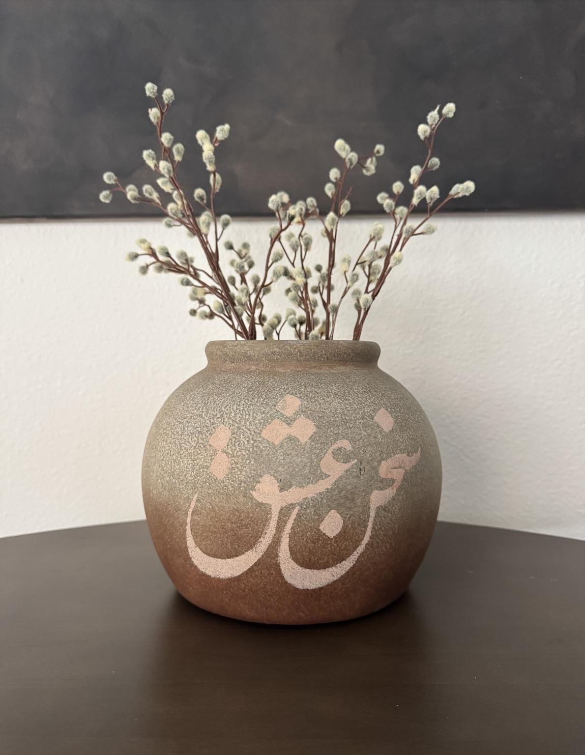 This ceramic vase features the phrase “sohaneh eshgh” meaning “power of love,” hand-painted in soft, neutral tones. Its classic silhouette and understated script make it a versatile accent for shelves, consoles, or coffee tables.